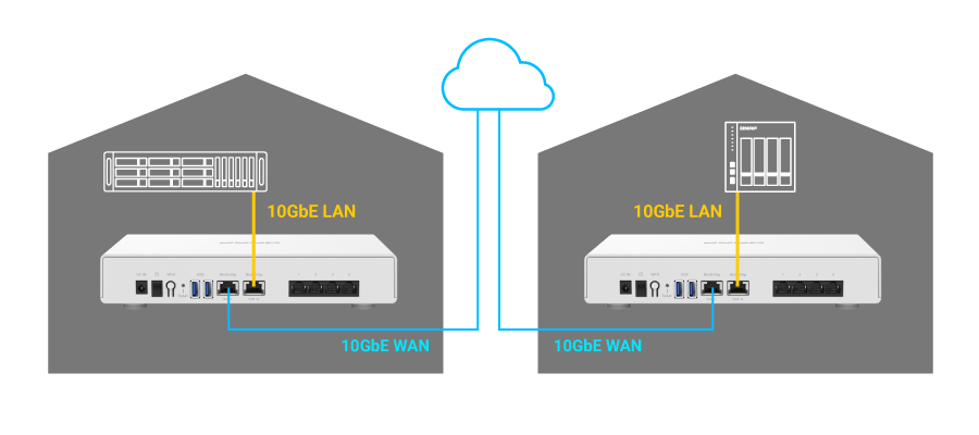 QHora-301W 提供 2 個 10GbE 埠,您可以依據應用情境,自行定義 2 個 10GbE 埠作為 WAN 或 LAN 網路使用。