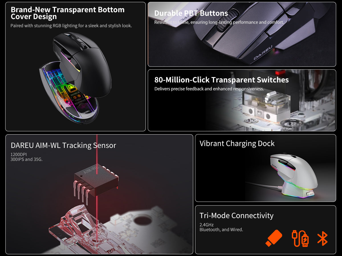 DAREU's next-generation exclusive wireless low-power optical engine, AIM-WL, provides optimized synergy for the mouse. It achieves 1:1 tracking accuracy while significantly enhancing stability and performance.