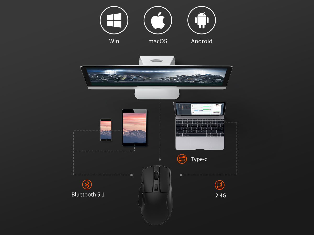 Support for Bluetooth, 2.4GHz wireless, and wired modes, compatible with Win/Mac systems and other devices for ultimate flexibility.